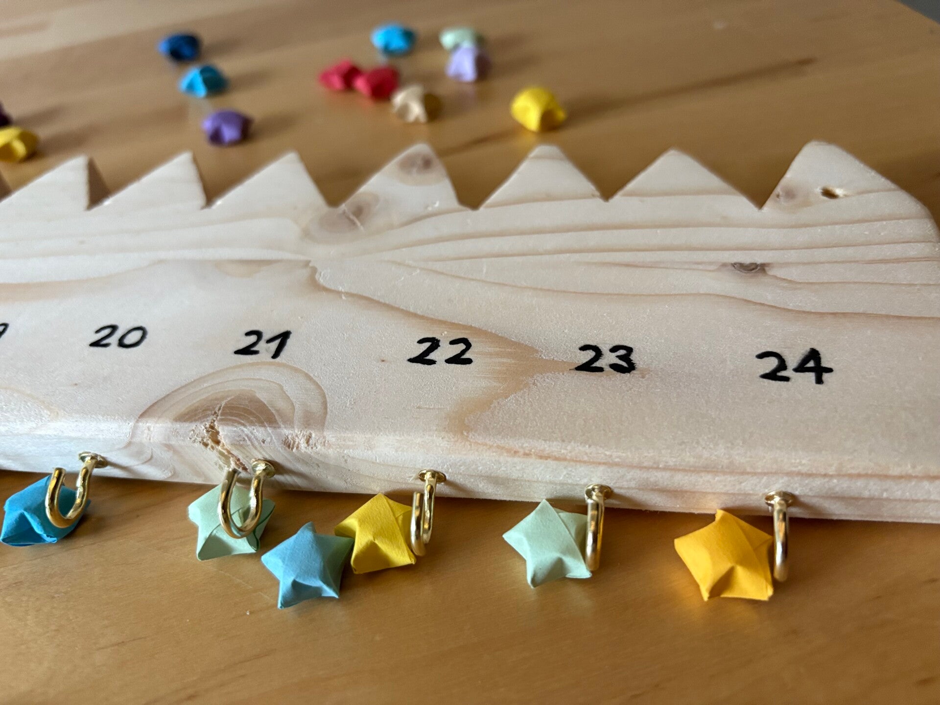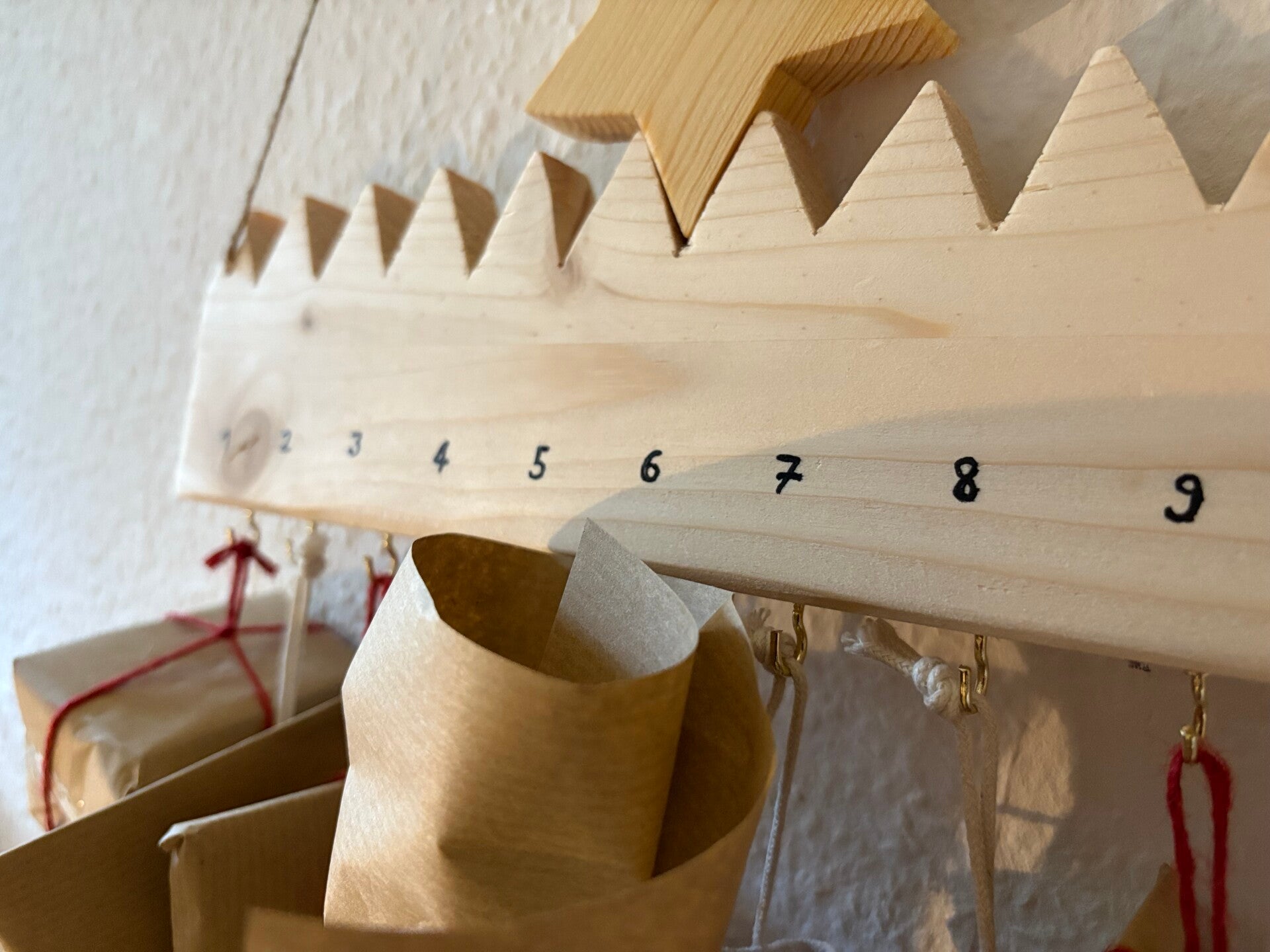 ein zeitloser adventsbegleiter aus holz (ca 75 x 9 cm), gefertigt in sorgfältiger handarbeit. mit haken für kleine überraschungen und einem stern, der tag für tag weiter wandert.